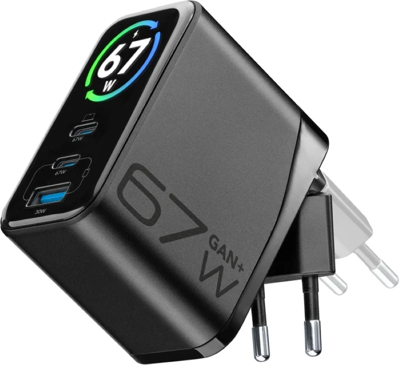 Das PowerView IQ 67W Wandladegerät gehört zur neuen Produktreihe von Cellularline, die für hohe Leistung und umfassende Kontrolle entwickelt wurde. Dank des intelligenten TFT-Displays werden Ladedaten in Echtzeit für jeden Anschluss angezeigt, darunter abgegebene Leistung, Wattzahl und Temperatur. Dies gewährleistet Transparenz und kontinuierliche Leistungsüberwachung. Zwei 67W USB-C-Anschlüsse und ein 30W USB-A-Anschluss ermöglichen effizientes Laden von Smartphones, Tablets und Laptops. Die GaN+-Technologie vereint hohe Leistung mit einem kompakten Design, während der klappbare Stecker die Tragbarkeit verbessert und das Ladegerät beim Transport schützt.